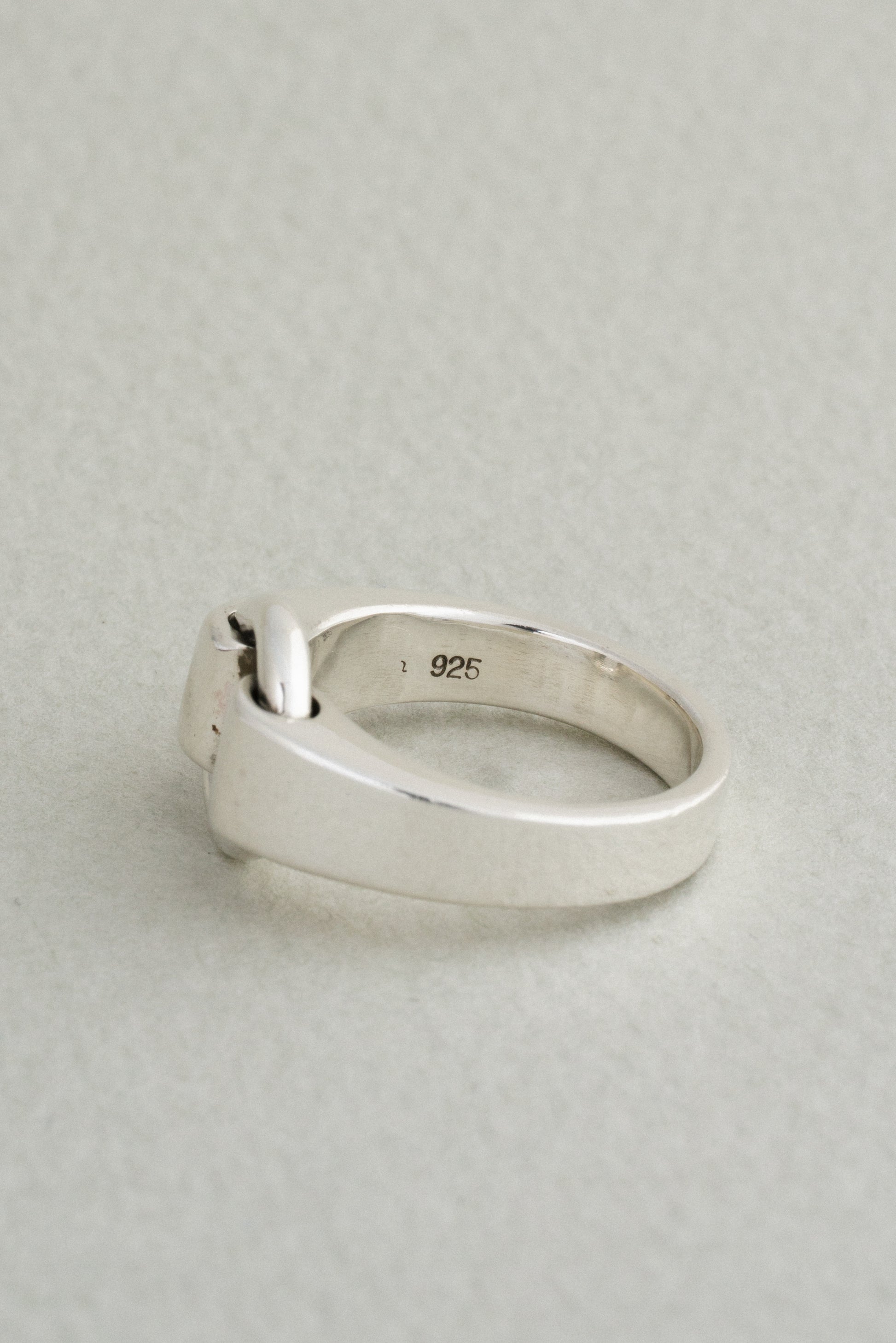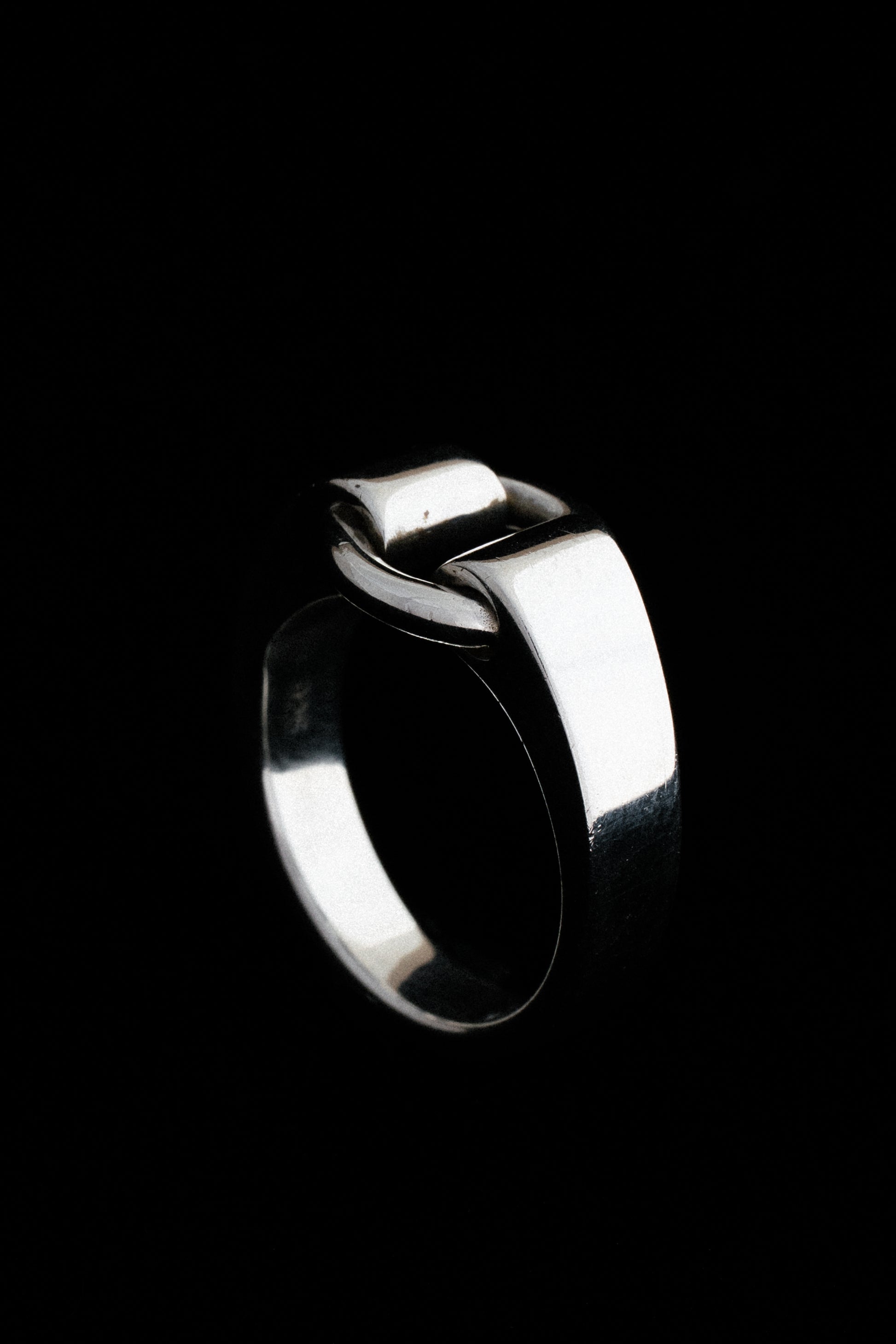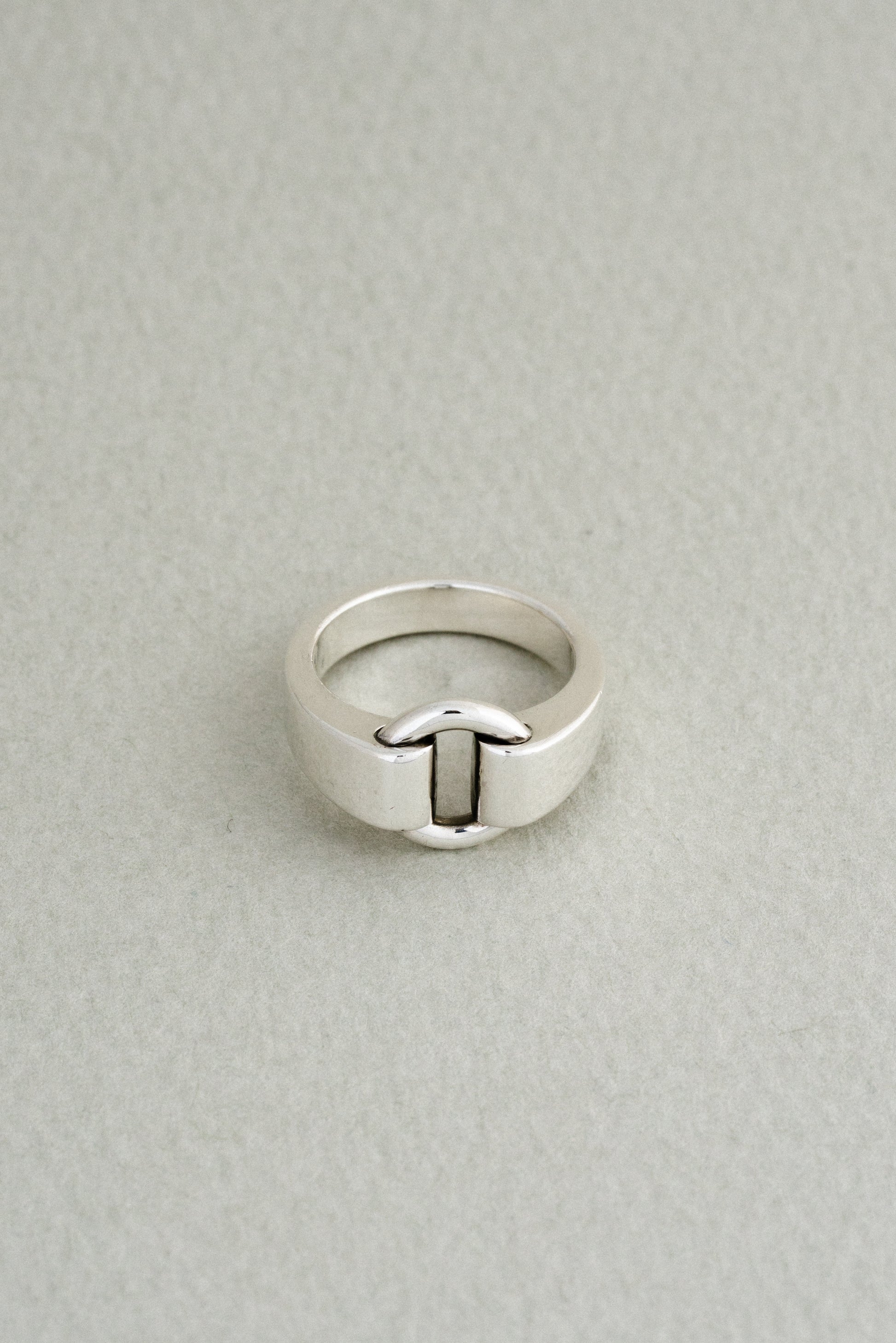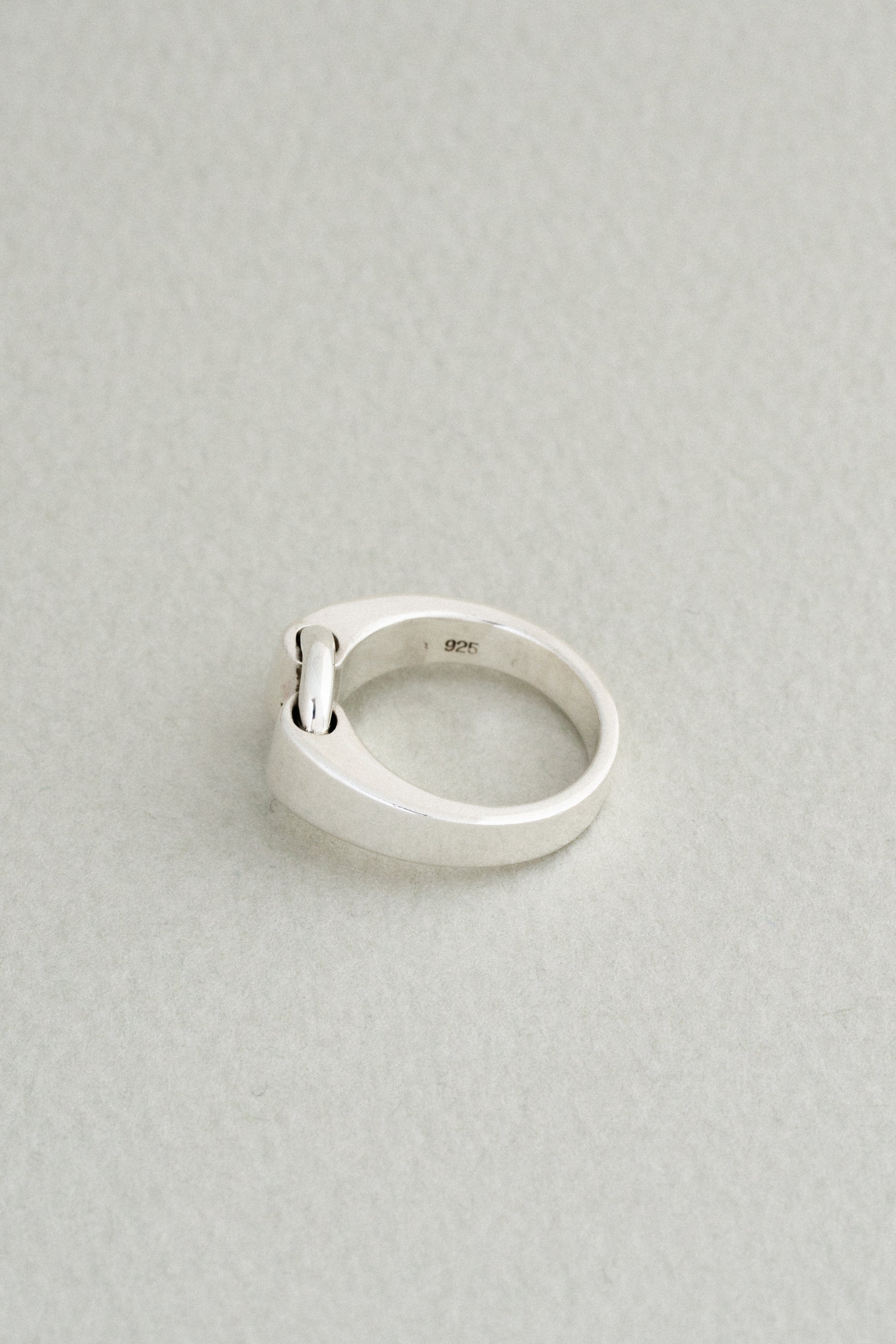 フロントにサークルモチーフがあしらわれた、ミニマルなシルバーリング。