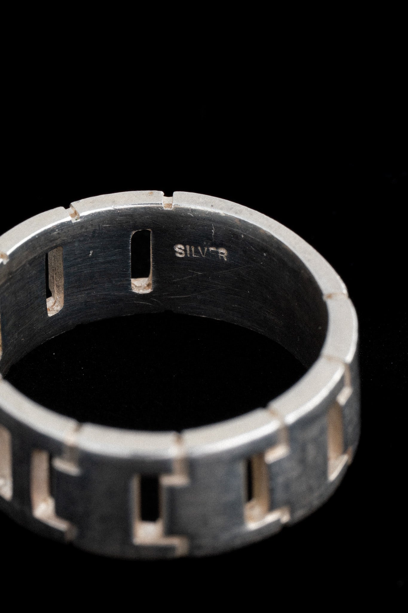 面ごとに切り込みの入った、幾何学的な表情が印象的なヴィンテージシルバーリング。