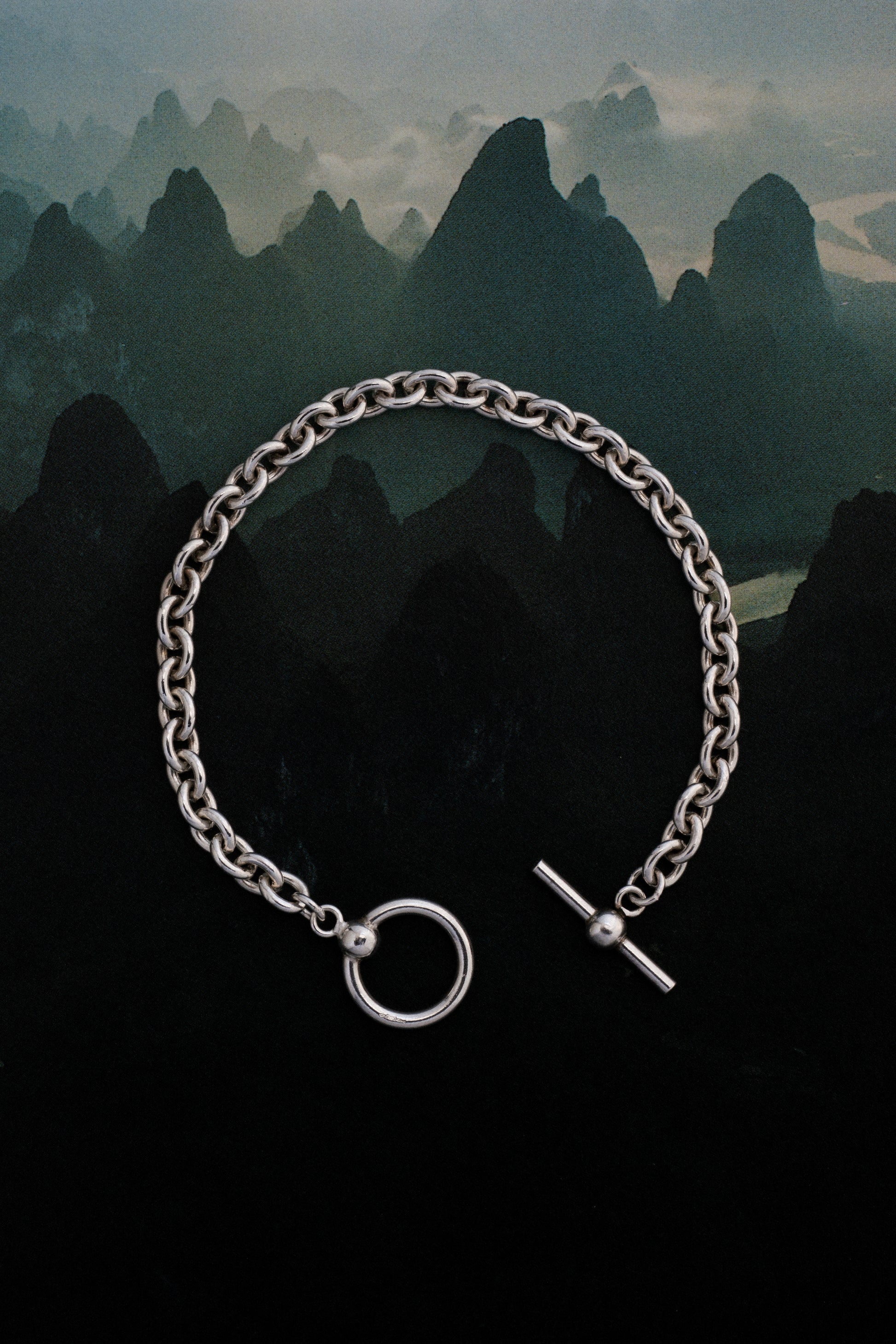 均一なオーバルリンクが連なるミニマルなチェーンで、しなやかに手首へ沿う着け心地が魅力です。シンプルながらTバーのトグルがアクセントとなり、手元を引き締めます。